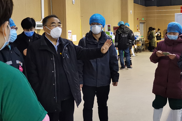 2月12日,全國人大代表、中央指導組專家組成員、中國工程院院士、天津中醫藥大學校長張伯禮(前排左三)在湖北武漢江夏方艙醫院指導工作。
