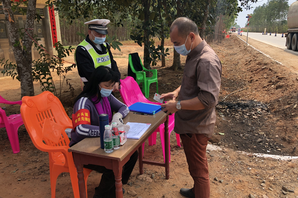 全國人大代表、湛江市遂溪縣吾良村婦女主任劉小權(左一)在村口設立黨員值班崗哨,對來往車輛及人員進行摸排登記和體溫監測,勸退勸返村民走親訪友、聚眾聚餐。