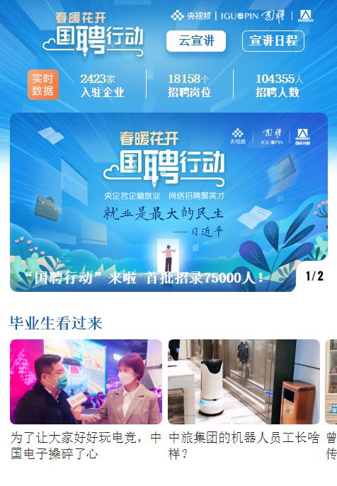 用戶只需下載“央視頻”客戶端并進入“國聘行動”專題頁面,即可通過滑動掌握近2500家入駐企業的招聘信息。并可通過在線簡歷投遞等方式,直通企業人力部門,實現全流程“無接觸”應聘。
