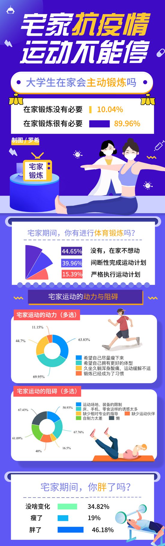 調查顯示,14.54%的受訪大學生“宅家”期間嘗試過多種類型的鍛煉,選擇在家運動的被采訪對象中,18.91%傾向于塑形鍛煉,10.93%偏愛減脂訓練,13.55%喜歡打羽毛球、籃球等運動。