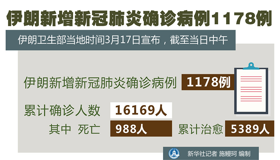 新華社德黑蘭3月17日電(記者陳霖)伊朗衛生部17日宣布,截至當日中午,伊朗新增新冠肺炎確診病例1178例,累計確診人數達到16169人,其中988人死亡,累計治愈5389人。