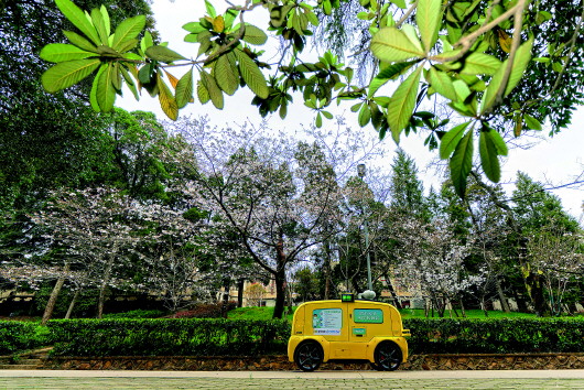 ▲一輛5G無人攝像車在武漢大學櫻花大道進行不間斷無人巡游,實時采集和傳輸直播圖像信號。(3月16日攝) 新華社記者費茂華攝