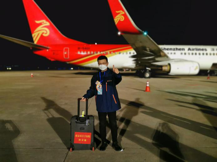 3月17日晚,柯章敏結束50多天的支援,從武漢乘坐飛機抵達南京祿口機場。受訪者供圖