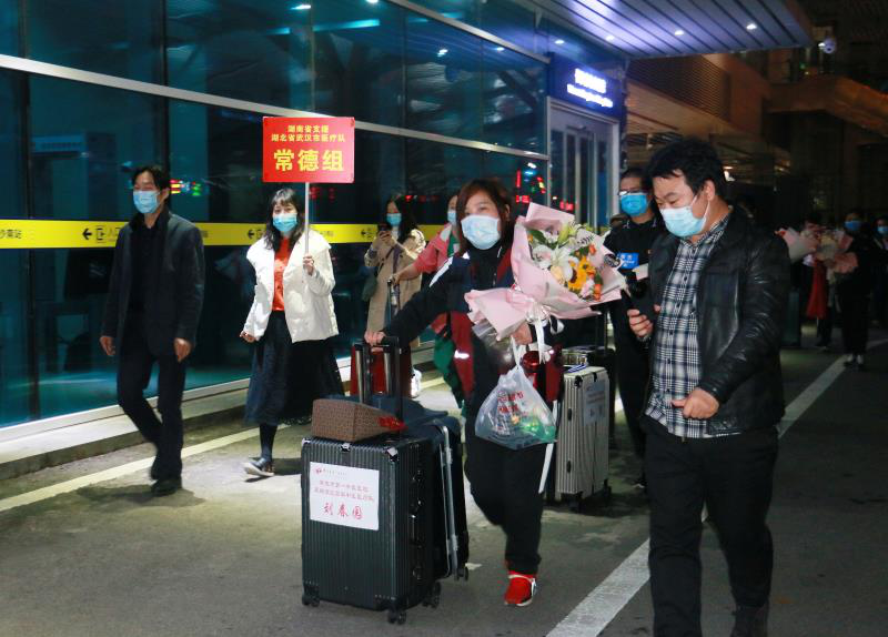 飛機落地后,走出艙門的醫護人員受到了家鄉人民的熱烈歡迎?!白叱雠撻T的第一感覺是回家真好!我是第二個出艙的,一下飛機就看到醫院的領導和同事們來接我們回家,心里特別溫暖,特別的感動?,F在最想做的,是結束隔離后回家看看親人,然后徹底地放松一下?!蹦喜髮W二附院呼吸與危重癥醫學科副主任護師余嬌說,“雖然我們回來了,但武漢還有我們的隊友,希望他們早日平安歸來。