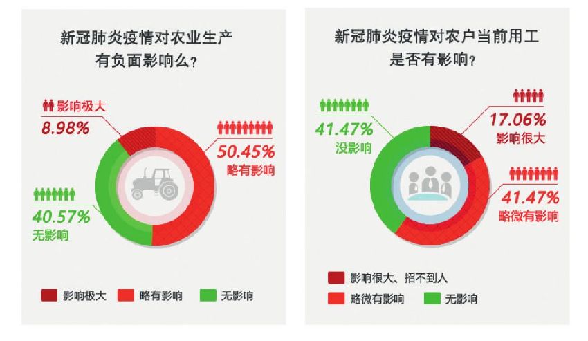 557份有效問卷數據顯示,8.98%的農戶認為疫情對農業生產負面影響極大,50.45%的農戶認為略有影響。在疫情對用工影響上,17.06%的農戶反映影響大、招不到人,41.47%的農戶認為略微有影響。(見圖1)