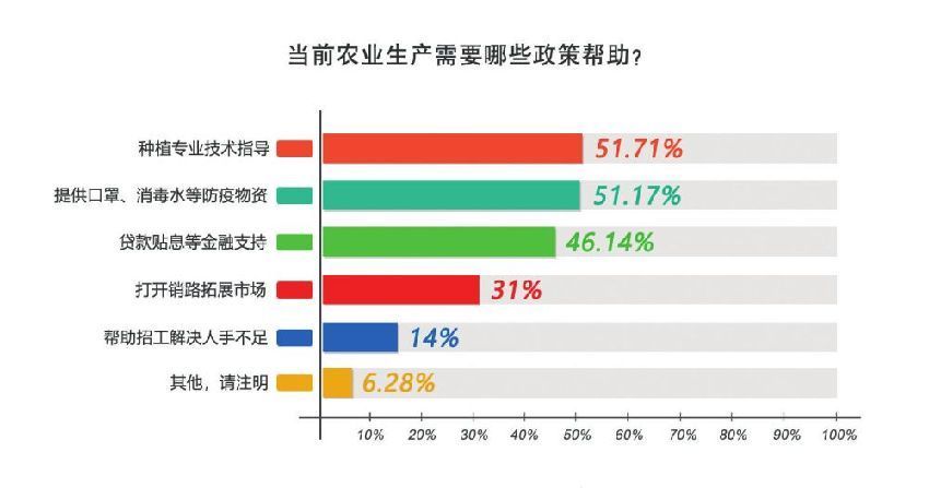 加強農技指導,給予金融支持。問卷調查中農戶提出多項政策需求,51.71%的農戶希望得到種植專業技術指導,51.17%的農戶呼吁提供口罩、消毒液等防疫物資,46.14%的農戶則希望得到貸款貼息等金融扶持。(見圖4)