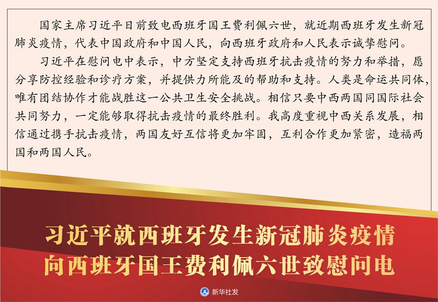習近平在慰問電中表示,中方堅定支持西班牙抗擊疫情的努力和舉措,愿分享防控經驗和診療方案,并提供力所能及的幫助和支持。人類是命運共同體,唯有團結協作才能戰勝這一公共衛生安全挑戰。相信只要中西兩國同國際社會共同努力,一定能夠取得抗擊疫情的最終勝利。我高度重視中西關系發展,相信通過攜手抗擊疫情,兩國友好互信將更加牢固,互利合作更加緊密,造福兩國和兩國人民。