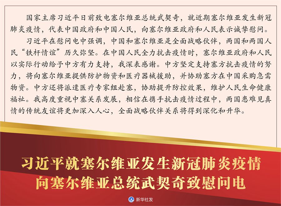 習近平在慰問電中強調,中國和塞爾維亞是全面戰略伙伴,兩國和兩國人民“鐵桿情誼”歷久彌堅。在中國人民全力抗擊疫情時,塞爾維亞政府和人民以實際行動給予中方有力支持,我深表感謝。中方堅定支持塞方抗擊疫情的努力,將向塞爾維亞提供防護物資和醫療器械援助,并協助塞方在中國采購急需物資。中方還將派遣醫療專家組赴塞,協助提升防控效果,維護人民生命健康福祉。我高度重視中塞關系發展,相信在攜手抗擊疫情過程中,兩國患難見真情的傳統友誼將更加深入人心,全面戰略伙伴關系將得到深化和升華。