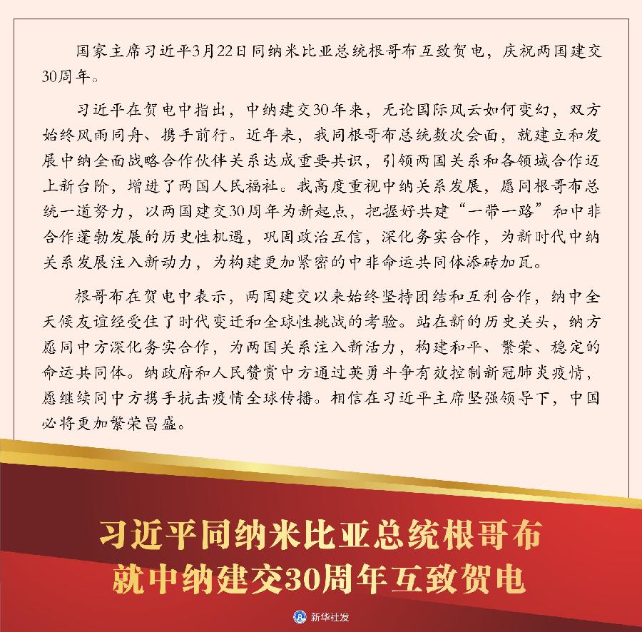 新華社北京3月22日電 國家主席習近平3月22日同納米比亞總統根哥布互致賀電,慶祝兩國建交30周年。