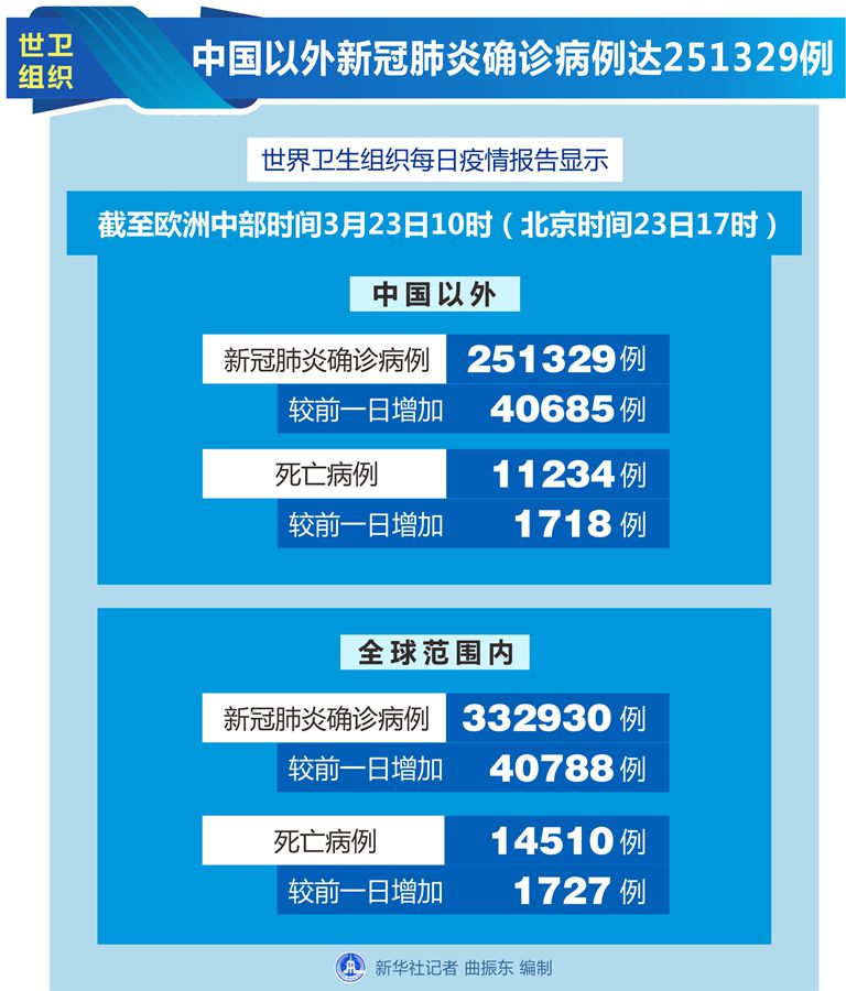 新華社日內瓦3月23日電(記者劉曲)世界衛生組織23日公布的最新數據顯示,中國以外新冠肺炎確診病例達到251329例。
