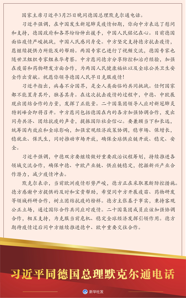 習近平強調,在中國發生新冠肺炎疫情初期,你向中方表達了慰問和支持,德國政府和各界紛紛伸出援手,中國人民銘記在心。目前德國面臨疫情嚴峻挑戰,中國人民感同身受。中方堅定支持德方抗擊疫情,愿繼續提供力所能及的幫助。兩國專家已進行了視頻交流,德國專家也隨世衛組織專家組來華考察。中方愿同德方分享防控和治療經驗,加強在疫苗和藥物研發方面合作,為兩國人民健康福祉以及全球公共衛生安全作出貢獻。祝愿你領導德國人民早日克服疫情!