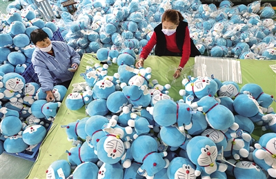 3月25日,山東臨沂沂南縣青駝鎮雙橋村扶貧車間農民在加工玩具。杜昱葆攝/光明圖片