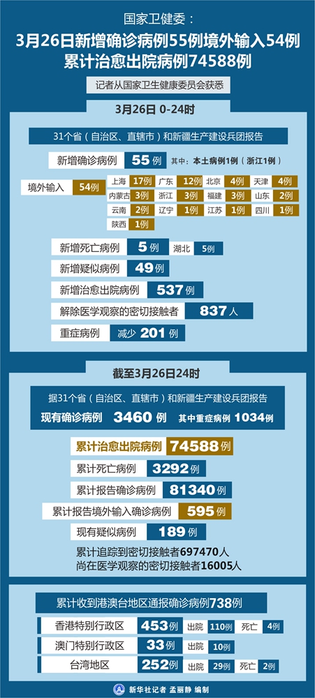 新華社北京3月27日電(記者齊中熙、張泉)記者27日從國家衛生健康委員會獲悉,3月26日0—24時,31個?。ㄗ灾螀^、直轄市)和新疆生產建設兵團報告新增確診病例55例,其中境外輸入病例54例,本土病例1例(浙江1例);新增死亡病例5例(湖北5例);新增疑似病例49例。
