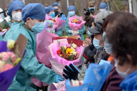 醫護人員祝?;颊叱鲈?。范顯海/攝