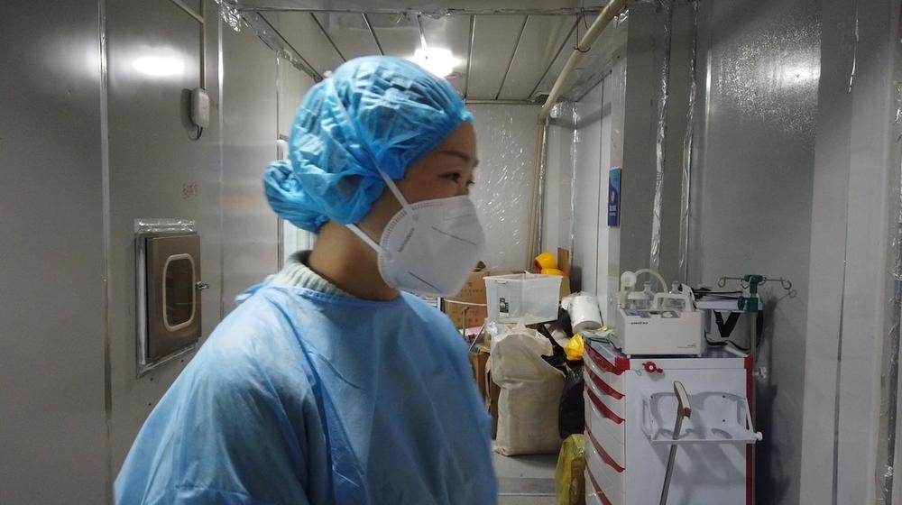 圖為遼寧援助武漢雷神山醫療隊隊員張倩在隔離病房外等待隊友。