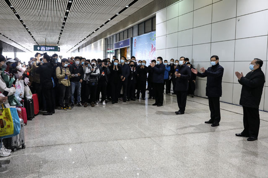 3月28日,武漢火車站,湖北省委書記應勇(右二),省委副書記、省長王曉東(右一)等人迎接從廣州南到武漢的G1112次列車乘客。記者 趙迪/攝
