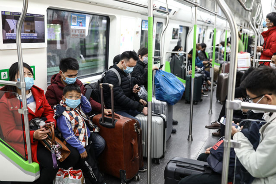 3月28日,武漢地鐵4號線,5歲的劉志皓和父母乘坐地鐵返回家中。他的父親在一家互聯網公司工作。記者 趙迪/攝