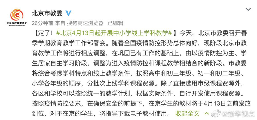 今天,北京市教委召開春季學期教育教學工作部署會。隨著全國疫情防控形勢總體向好,現階段北京市教育教學工作將進行相應調整,在鞏固已有工作的基礎上,由以疫情防控為主、學生居家自主學習階段,調整為進入疫情防控和課程教學相結合的新階段。市教委將綜合考慮學科特點和線上教學條件,按照高中和初三年級、初一和初二年級、小學各年級的順序,分批次上線學科課程資源。除了直接選用市級課程資源外,各區和學??梢园凑战y一的教學計劃,根據實際條件,自行開發使用課程資源。按照疫情防控要求,在確保安全的前提下,在京學生的教材將于4月13日之前發放到位,對不在京的學生,將指導下載電子教材使用。