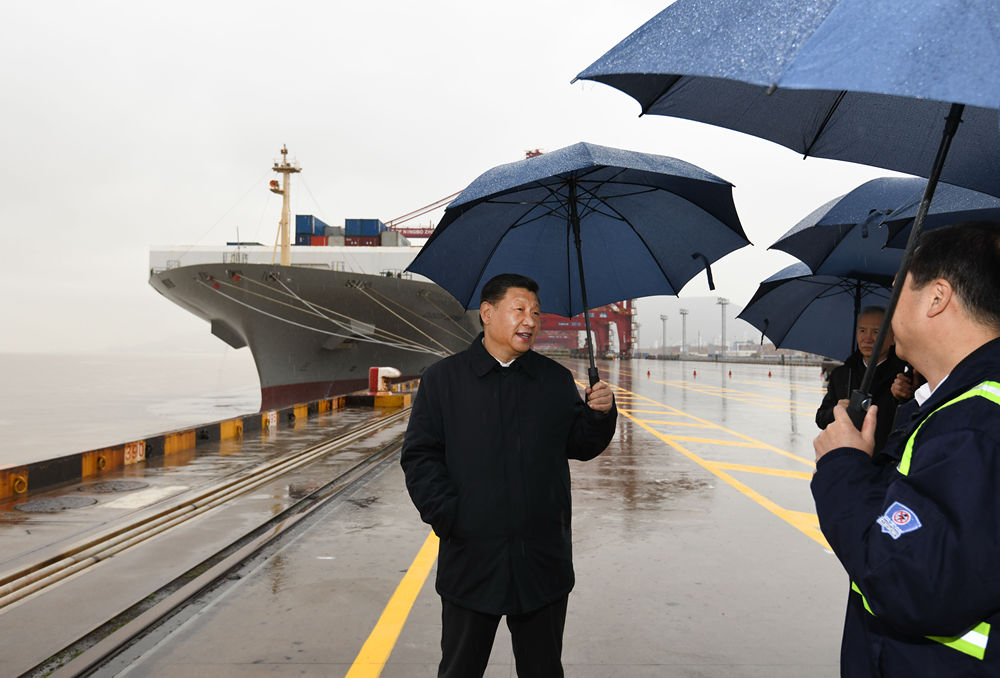 當時,總書記正在穿山港區2號集裝箱泊位察看碼頭現場作業情況。海風卷著細雨,空氣十分清新,周邊環境也很空曠,人員之間保持著比較大的距離?!?