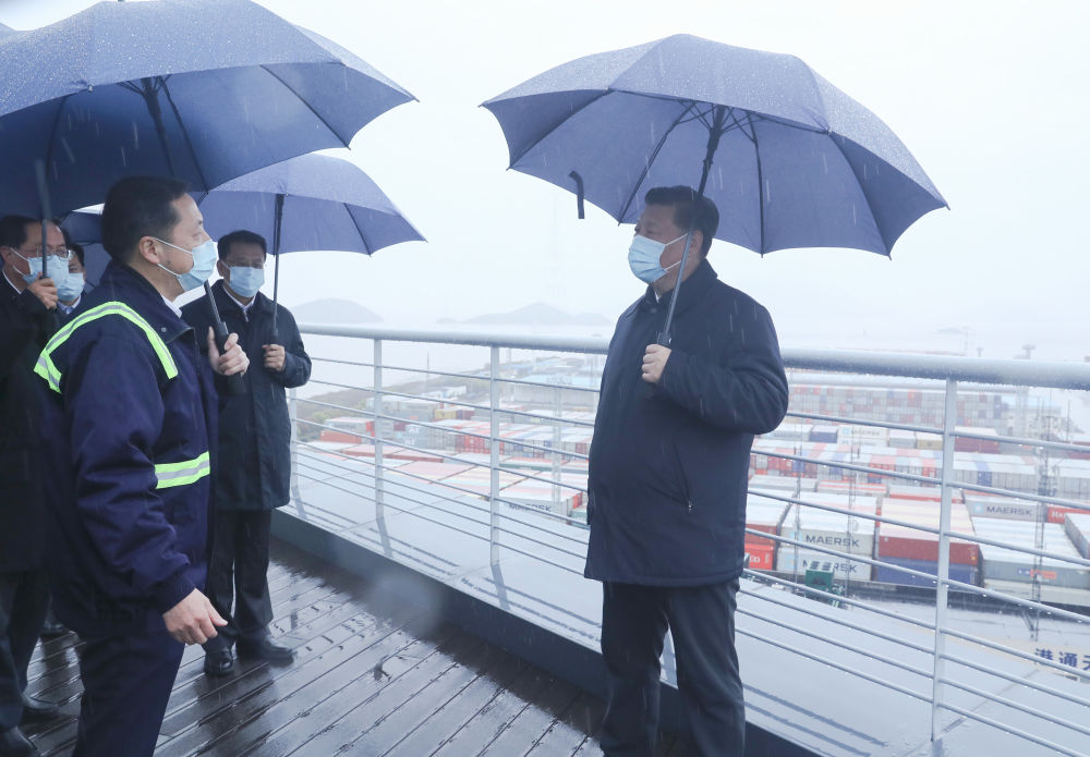 從新華社發出的現場照片看,總書記在寧波舟山港穿山港區碼頭上沒有佩戴口罩?!?