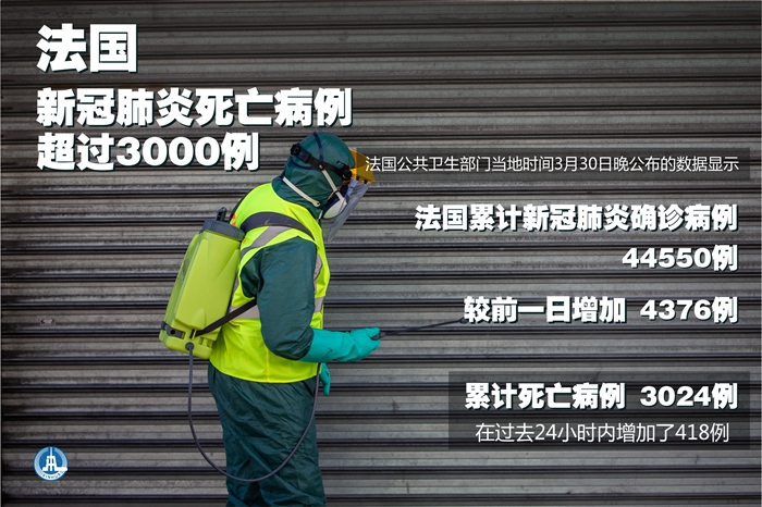 新華社巴黎3月30日電(記者陳晨)法國公共衛生部門30日晚公布的數據顯示,法國累計新冠肺炎確診病例44550例,較前一日增加4376例;累計死亡病例3024例,在過去24小時內增加了418例。