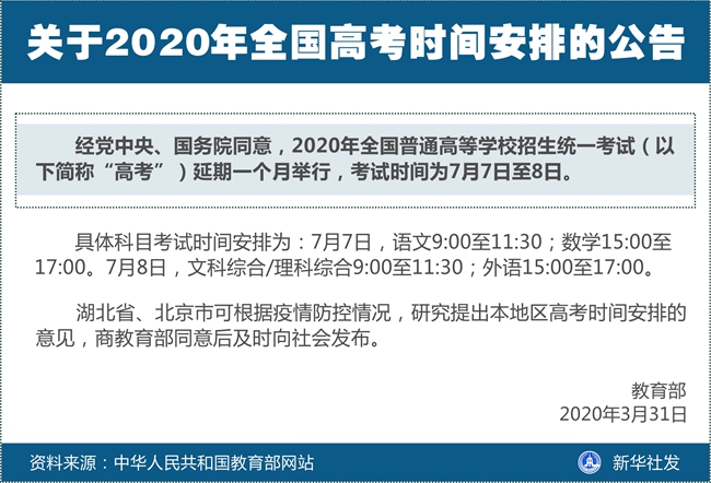 新華社北京3月31日電(記者施雨岑)記者31日從教育部獲悉,經黨中央、國務院同意,2020年全國普通高等學校招生統一考試延期一個月舉行,考試時間為7月7日至8日。