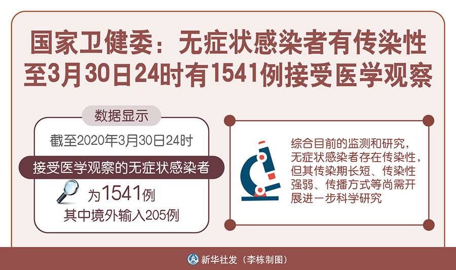 新華社北京3月31日電(記者王秉陽)國家衛健委31日在官網發布《關于新型冠狀病毒無癥狀感染者的防控工作答問》,對近來網民熱議的無癥狀感染者相關問題進行回答。數據顯示,截至2020年3月30日24時,接受醫學觀察的無癥狀感染者為1541例,其中境外輸入205例。