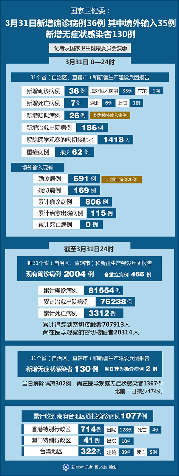 截至3月31日24時,據31個?。ㄗ灾螀^、直轄市)和新疆生產建設兵團報告,現有確診病例2004例(含重癥病例466例),現有疑似病例172例。累計確診病例81554例,累計治愈出院病例76238例,累計死亡病例3312例,累計追蹤到密切接觸者707913人,尚在醫學觀察的密切接觸者20314人。