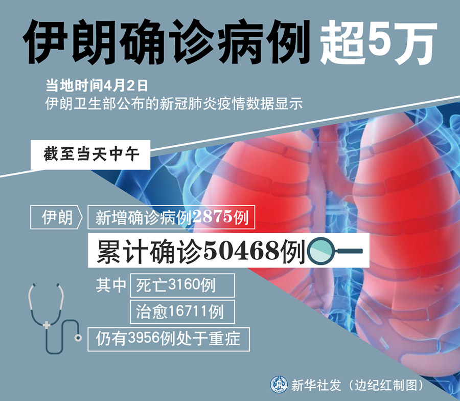 新華社德黑蘭4月2日電(記者陳霖)伊朗衛生部2日公布的新冠肺炎疫情數據顯示,截至當天中午,伊朗新增確診病例2875例,累計確診50468例,其中死亡3160例,治愈16711例,仍有3956例處于重癥。