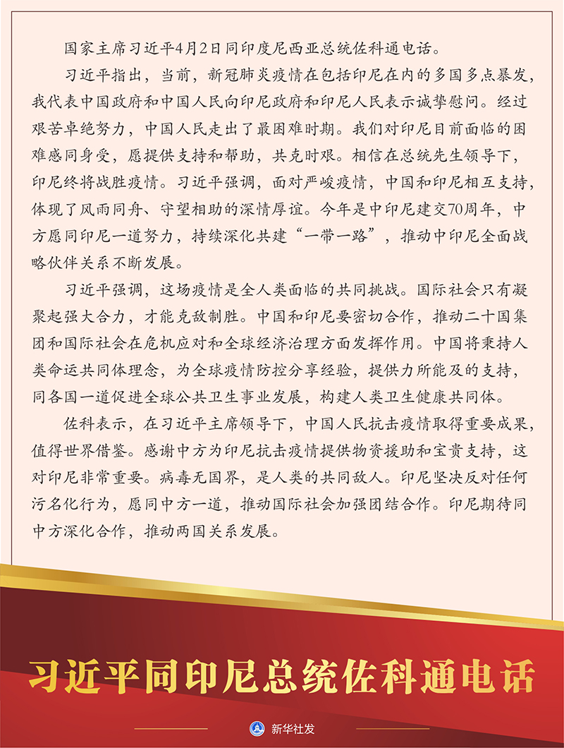 習近平強調,這場疫情是全人類面臨的共同挑戰。國際社會只有凝聚起強大合力,才能克敵制勝。中國和印尼要密切合作,推動二十國集團和國際社會在危機應對和全球經濟治理方面發揮作用。中國將秉持人類命運共同體理念,為全球疫情防控分享經驗,提供力所能及的支持,同各國一道促進全球公共衛生事業發展,構建人類衛生健康共同體。