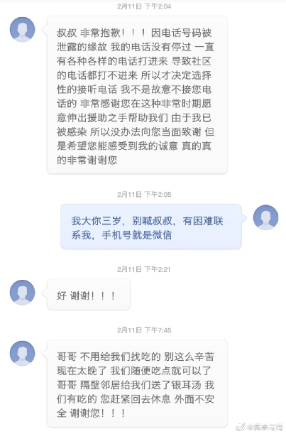 后來,老人每天打電話給所有跟他聯系過的志愿者,說需要什么物資。而當他們定期回訪其他求助者時,大部分人都會說,不需要幫助了,謝謝你們。樓威辰漸漸覺得老人自私貪婪,就不再接電話了。