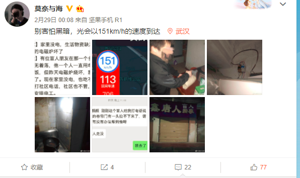 2月28日晚上10點多,樓威辰收到一項特殊的求助。一個獨居盲人張磊(化名)因電磁爐燒壞導致跳閘停電,無法做飯,打電話給社區,社區說暫時沒法安排電工,只好通過朋友在網上求助。