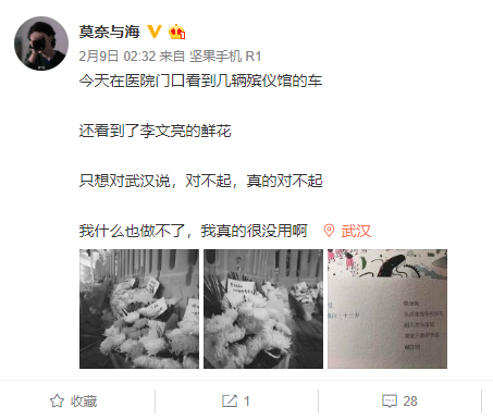 2月8日,他送一個紅會志愿者去武漢市中心醫院,給李文亮醫生獻花。他在醫院門口看到幾輛殯儀館的車,門診大門前堆滿了花束,連院外圍欄也放了一排鮮花在地上,每束花都有一個小紙條,寄托著同一種情緒。