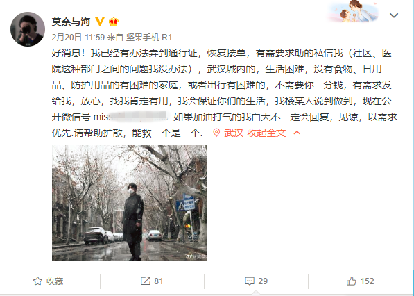 最近很少收到求助信息了。社區開始有限放行,市內交通在逐步恢復,各行各業也在陸續復工。這意味著,武漢已經不太需要他這樣的志愿者了。