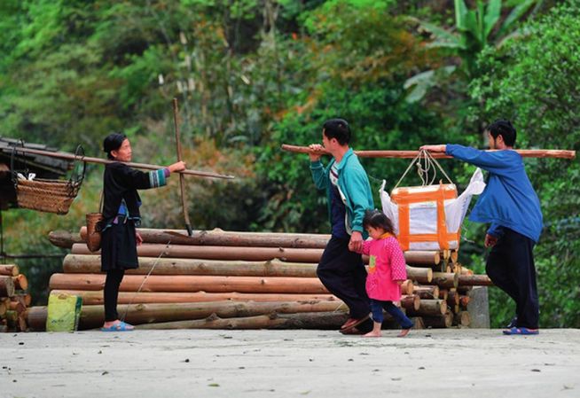 3月25日,桂黔烏英苗寨,村民抬著廣西融水苗族自治縣扶貧部門送來的螺苗,準備投放 黃孝邦攝/本刊