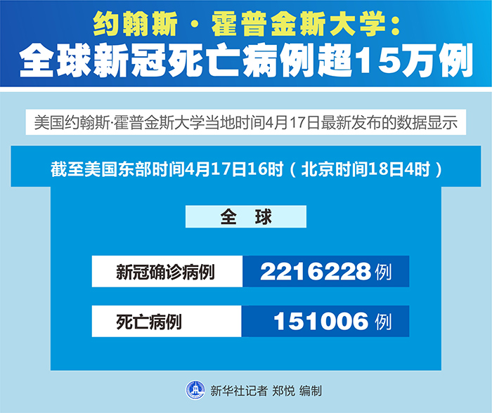 新華社紐約4月17日電 美國約翰斯·霍普金斯大學17日最新發布的數據顯示,截至美國東部時間17日16時(北京時間18日4時),全球新冠死亡病例超過15萬例,達到151006例,全球確診病例達2216228例。