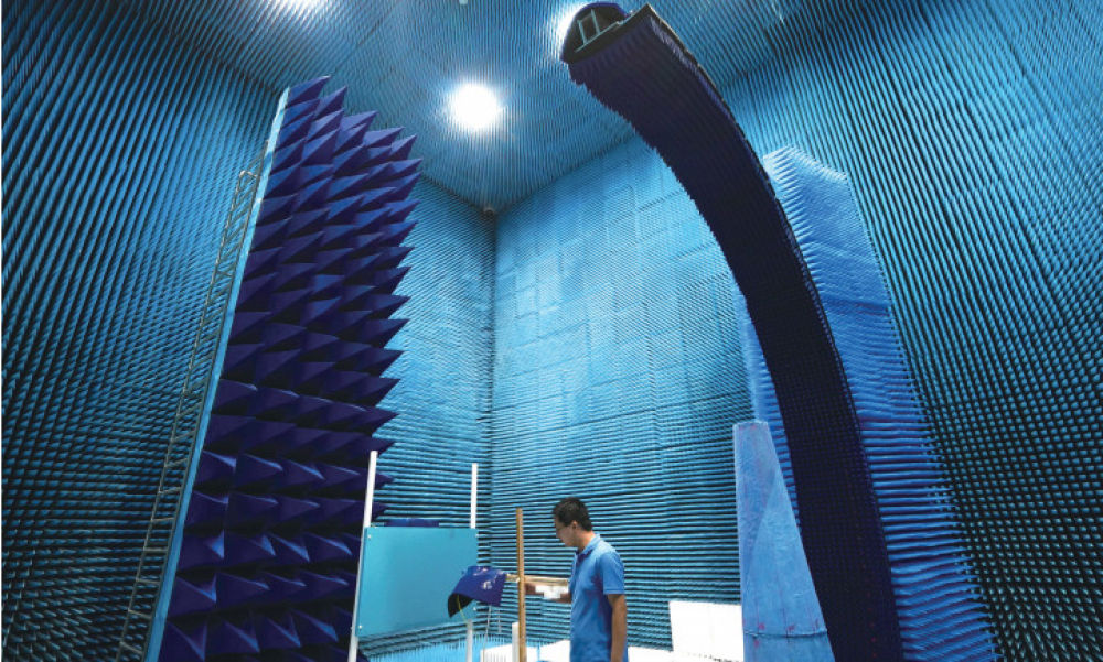 2019年6月6日,在江蘇南京江寧經濟技術開發區,科研人員在網絡通信與安全紫金山實驗室的微波暗室內工作。該實驗室已經宣布成功研發5G移動通信核心的毫米波芯片(李響/攝)