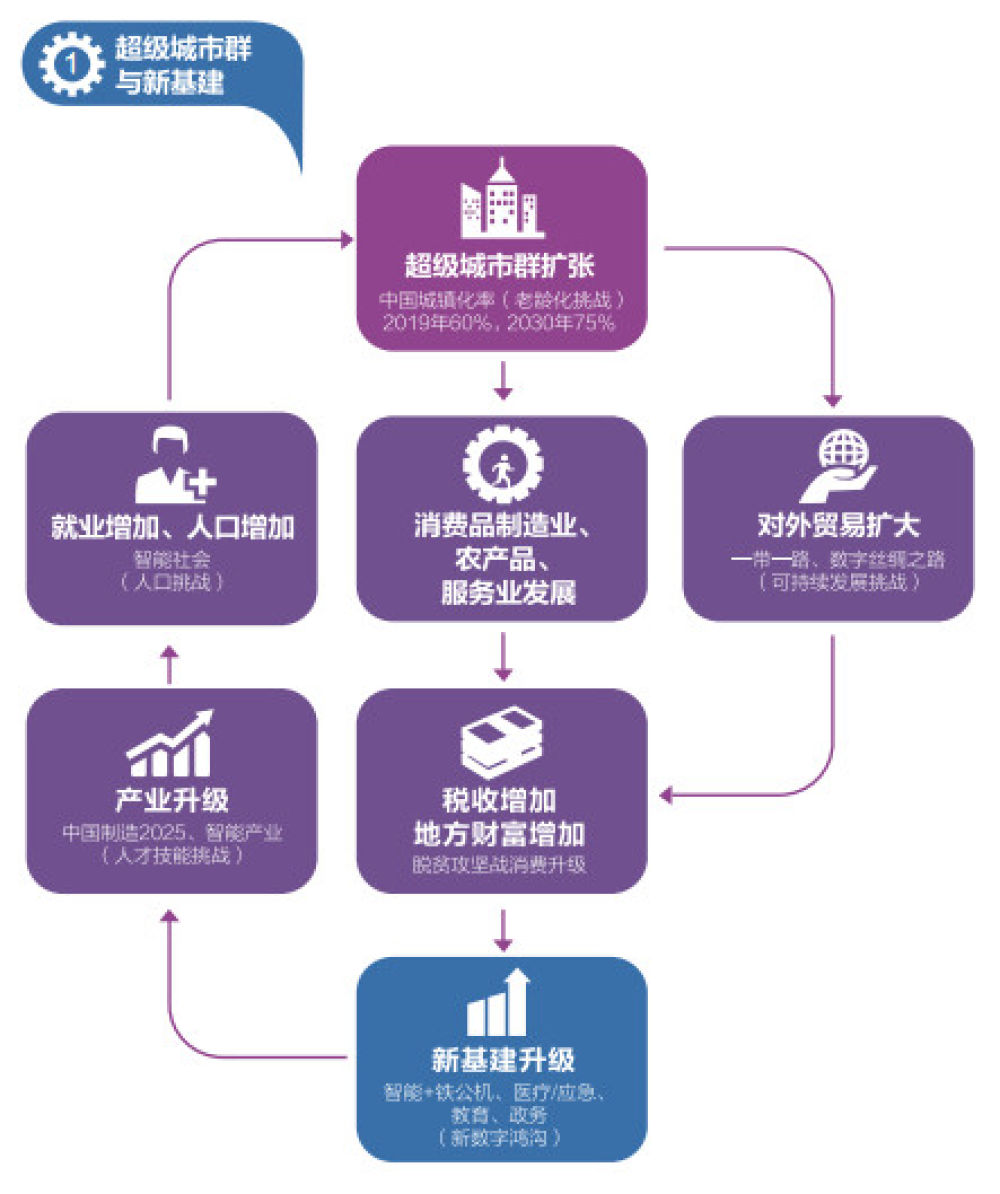 中國城鎮化率2019年是60%,預計2030年將達到75%。在此過程中,城市群擴張將帶來區域產業集群分工、消費升級、地方財富與稅收增加,進一步促進基礎設施升級、產業升級、區域人口與就業增加,形成良性循環。但其中也蘊含著新數字鴻溝、老齡化、產業工人技能再造與可持續發展等諸多挑戰。