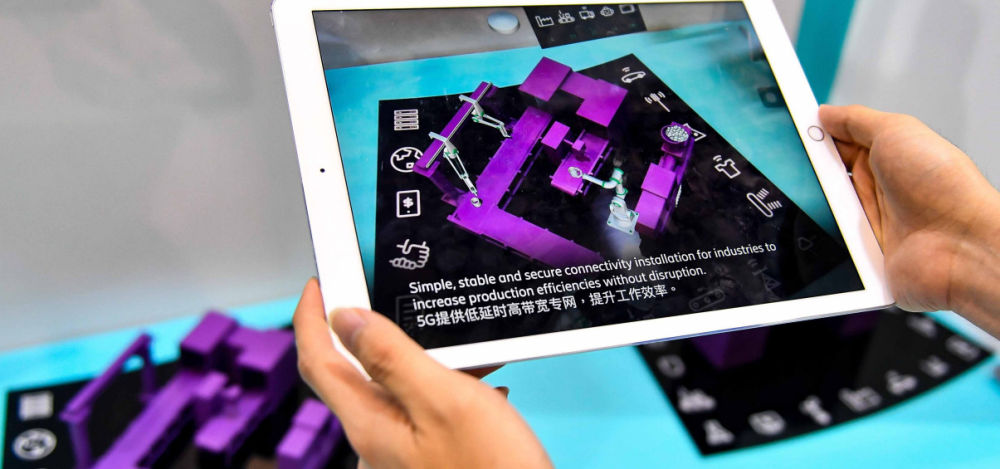 2019中國工業互聯網大會暨粵港澳大灣區數字經濟大會上,工作人員向媒體展示“5G+AR”工業應用
