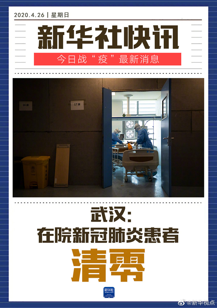 當日下午在北京舉行的國務院聯防聯控機制新聞發布會上,國家衛生健康委新聞發言人米鋒也介紹說,經過武漢和全國援鄂醫務人員的共同努力,至26日,武漢在院新冠肺炎患者清零。