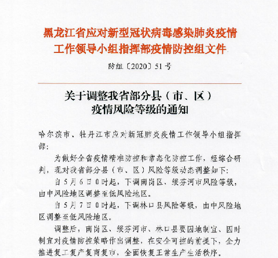 自5月6日0時起,下調哈爾濱市南崗區、綏芬河市風險等級,由中風險地區調整至低風險地區。