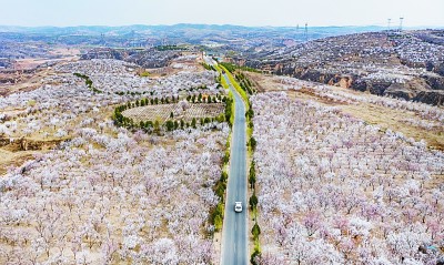 近日,在陜西省榆林市榆陽區南部山區,漫山遍野杏花盛開,黃土高坡生機勃勃。新華社發