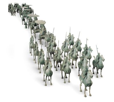 圖為武威雷臺漢墓的銅車馬武士儀仗俑。