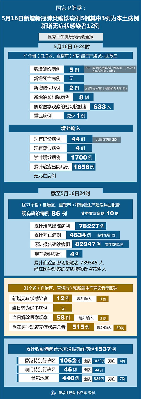 截至5月16日24時,據31個?。ㄗ灾螀^、直轄市)和新疆生產建設兵團報告,現有確診病例86例(其中重癥病例10例),累計治愈出院病例78227例,累計死亡病例4634例(吉林核增1例),累計報告確診病例82947例(吉林核增1例),現有疑似病例4例。累計追蹤到密切接觸者739545人,尚在醫學觀察的密切接觸者4724人。