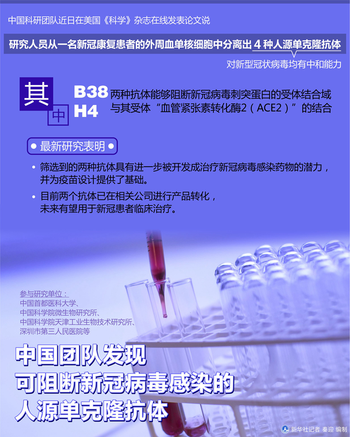 圖表:中國團隊發現可阻斷新冠病毒感染的人源單克隆抗體 新華社記者 秦迎 編制