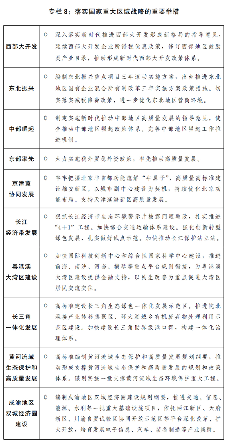 一是落實落細重大區域發展戰略。落實區域協調發展新機制,持續推進西部大開發形成新格局,支持東北地區全面振興全方位振興,健全中部地區崛起政策體系和工作機制,繼續推動東部地區率先發展??v深推進京津冀協同發展,加快實施雄安新區重點建設項目,完善北京非首都功能疏解政策體系。大力推進長江經濟帶生態環境突出問題整改和系統性保護修復,加快構建綜合交通運輸體系,促進內河船舶改造。推動粵港澳大灣區基礎設施互聯互通,有序開展國際科技創新中心建設,加快橫琴、河套等重大合作平臺建設。高標準建設長三角生態綠色一體化示范區,推動長三角交通一體化更高質量發展,建設虹橋國際開放樞紐。抓緊做好黃河流域生態保護和高質量發展規劃綱要編制和出臺實施工作。大力支持成渝地區雙城經濟圈建設,打造全國高質量發展的重要增長極。積極推進西部陸海新通道建設。深化對口支援。支持少數民族和民族地區加快發展。推動國家級新區、開發區等功能平臺創新提升發展,加快推進資源型地區經濟轉型和老工業城市更新改造。推動山西開展能源革命綜合改革試點。繼續推進承接產業轉移示范區建設,在具備條件的內陸城市打造一批高端制造業基地。制定發展海洋經濟加快建設海洋強國的意見。完善主體功能區戰略和制度,編制《全國國土空間規劃綱要(2021-2035)》。