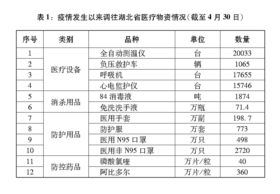 大力加強醫療物資生產供應和醫療支持服務。疫情防控阻擊戰,也是后勤保障戰。疫情初期,武漢市醫療防護物資極度短缺,為了節省防護用品、爭分奪秒搶救病患,一線醫護人員克服困難,最大限度地延長防護用品使用時間。為盡快解決醫療資源短缺和病患急劇增多的突出矛盾,中國充分發揮制造業門類全、韌性強和產業鏈完整配套的優勢,克服春節假期停工減產等不利因素,開足馬力,深挖潛力,全力保障上下游原料供應和物流運輸,保證疫情防控物資的大規模生產與配送。醫療企業克服工人返崗不足等困難,以最快速度恢復醫療用品生產,最大限度擴大產能。其他行業企業迅速調整轉產,生產口罩、防護服、消毒液、測溫儀等防疫物資,有效擴大了疫情防控物資的生產供應??焖賳臃揽蒯t療物資應急審批程序,全面加強質量安全監管,確保以最快的速度批準上市、促產保供,截至5月31日,共應急批準17個藥物和疫苗的19件臨床試驗申請,附條件批準2個疫情防控用藥上市。在各方共同努力下,醫用物資產能不斷提升,醫用物資保供實現從“緊缺”到“緊平衡”“動態平衡”“動態足額供應”的跨越式提升(表2)。2月初,醫用非N95口罩、醫用N95口罩日產量分別為586萬只、13萬只,到4月底分別超過2億只、500萬只。暢通供應鏈條和物流渠道,建立聯保聯供協作機制,源源不斷地把全國支援物資運送到疫情防控重點地區。