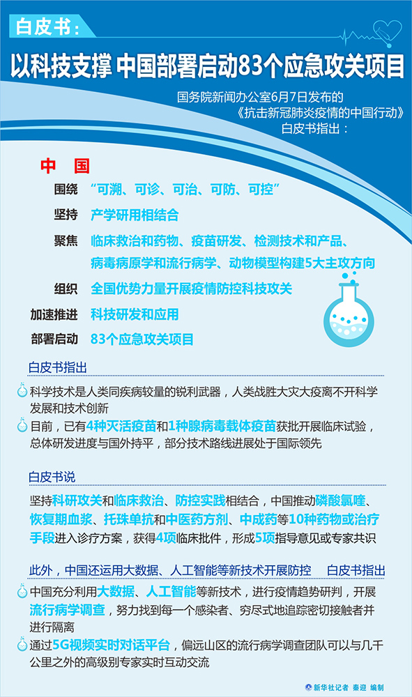新華社北京6月7日電(記者胡喆)國務院新聞辦公室7日發布的《抗擊新冠肺炎疫情的中國行動》白皮書指出,中國圍繞“可溯、可診、可治、可防、可控”,堅持產學研用相結合,聚焦臨床救治和藥物、疫苗研發、檢測技術和產品、病毒病原學和流行病學、動物模型構建5大主攻方向,組織全國優勢力量開展疫情防控科技攻關,加速推進科技研發和應用,部署啟動83個應急攻關項目。