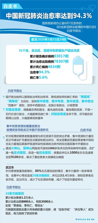 新華社北京6月7日電(記者王秉陽)國務院新聞辦公室7日發布的《抗擊新冠肺炎疫情的中國行動》白皮書指出,截至2020年5月31日24時,31個省、自治區、直轄市和新疆生產建設兵團累計報告確診病例83017例,累計治愈出院病例78307例,累計死亡病例4634例,治愈率94.3%,病亡率5.6%。