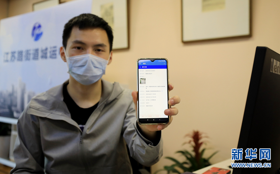 6月8日,在上海江蘇路街道城運中心,工作人員展示手機上收到的路面垃圾暴露待處理報警信息。 新華社記者 方喆攝